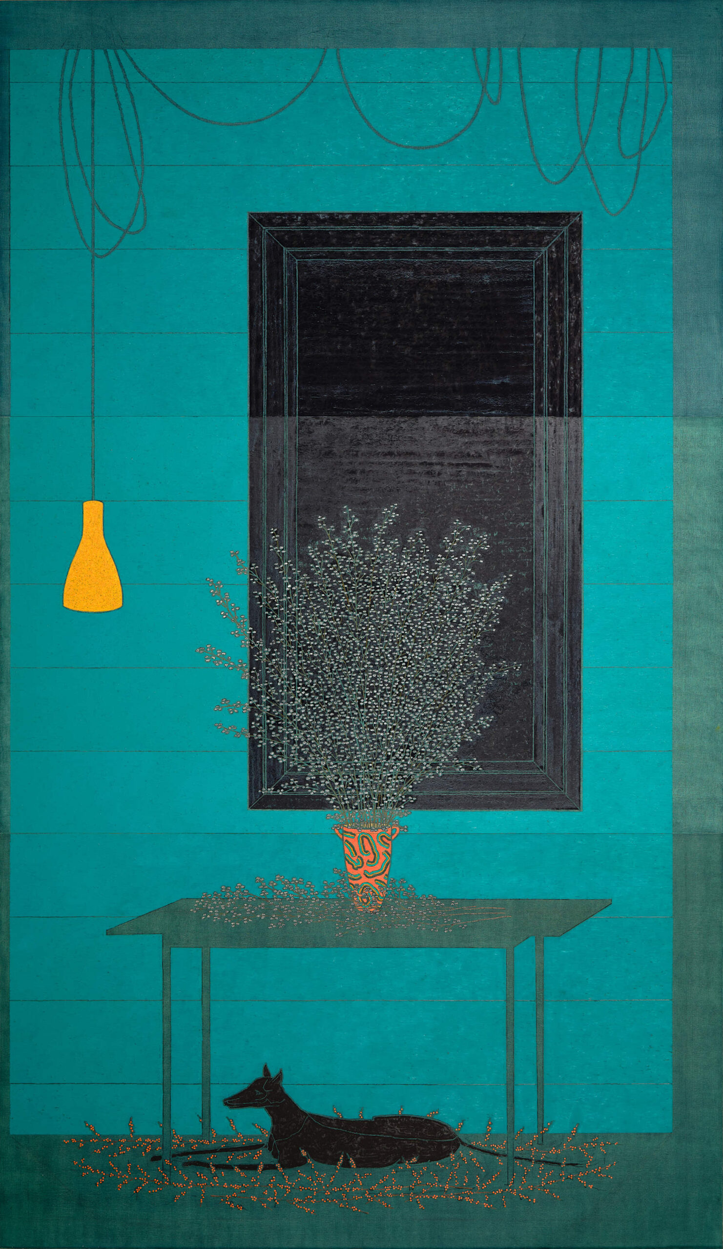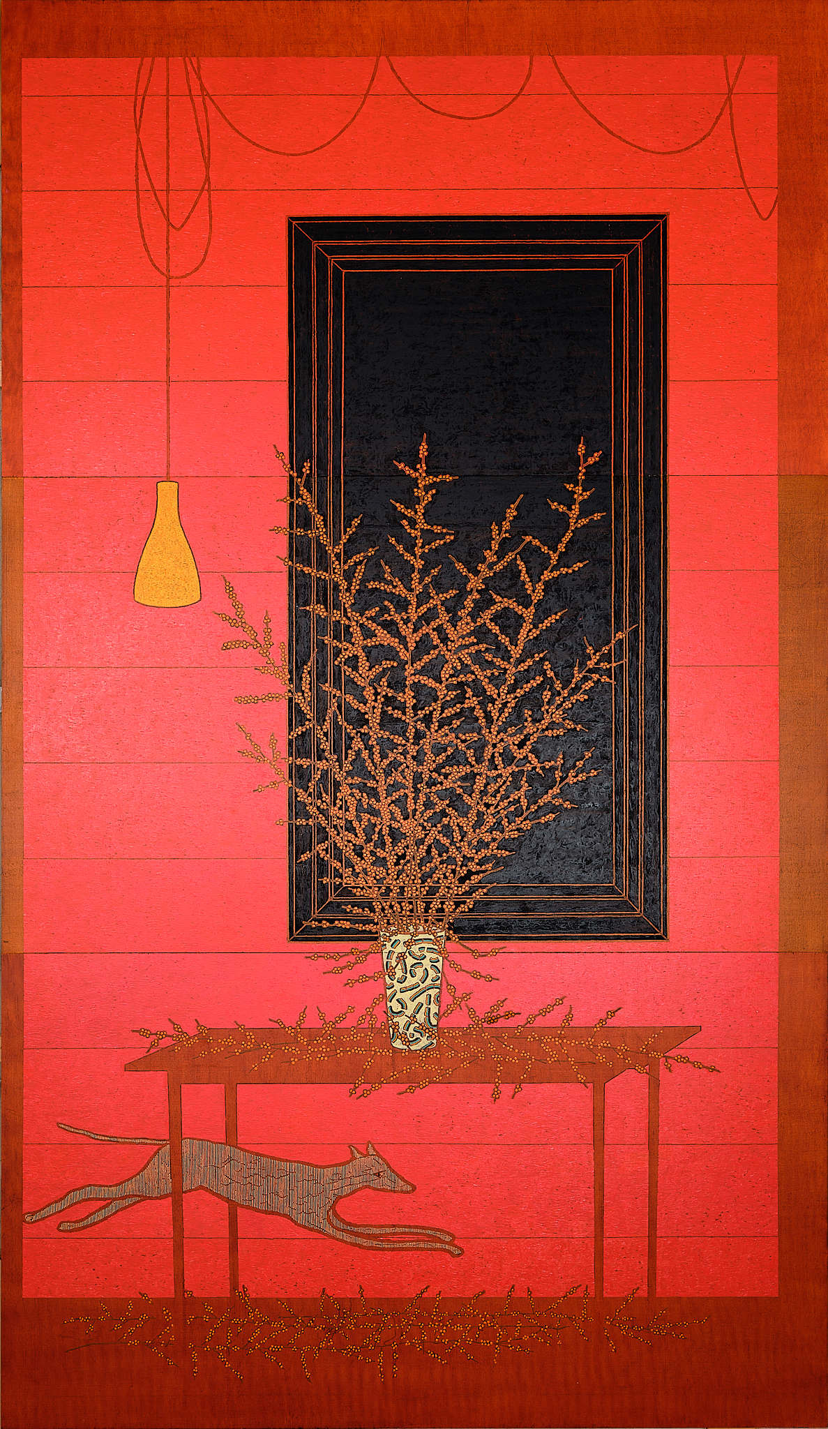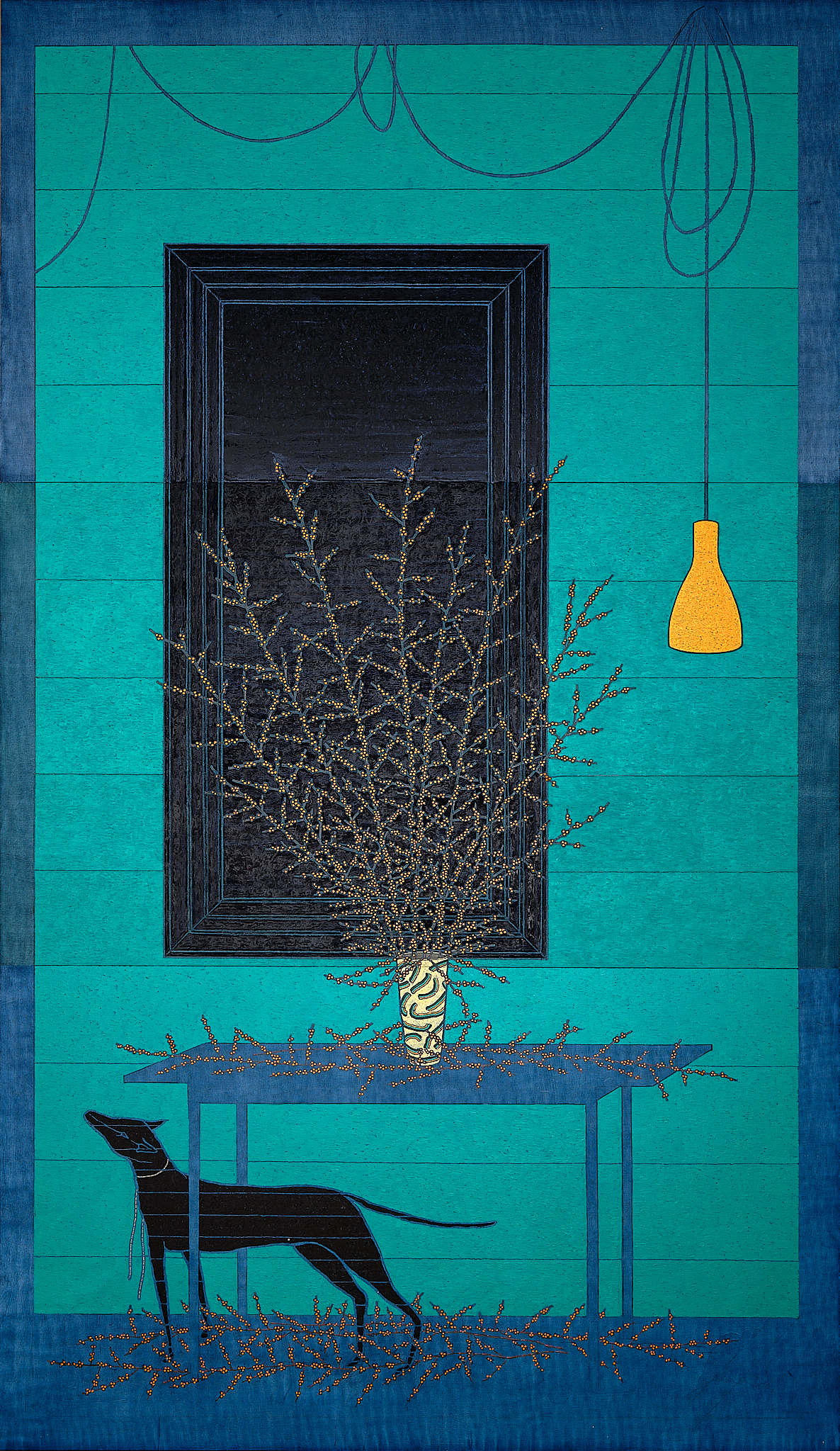 The painting is housed in main reception area at the hotel’s entrance level. The dimensions were prescribed and given the location at the heart of the building I knew it would become the meeting point for hotel guests while arriving, departing and preparing for dinner. A dog, a sight hound, lies beneath a table; guardian, elegant and perhaps unexpected in an august hotel environment. I liked the idea that guests would arrange to convene in front of the hound.